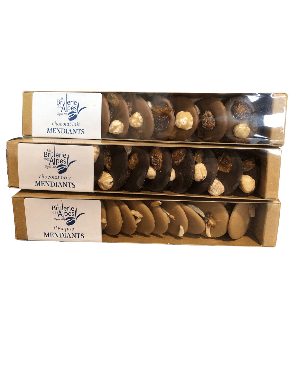 Trio de mendiants au chocolat noir, lait et blanc caramel