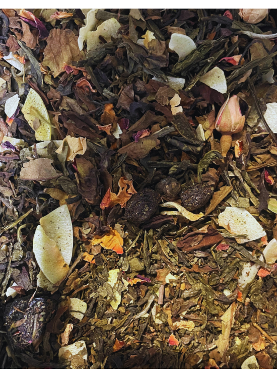 Riche en catéchines, ce Thé Blanc - Framboise, Goji et Bergamote, ce thé offre une véritable infusion bien-être aux nombreuses vertus. Bon dans votre tasse, il l'est aussi pour votre peau. Thé blanc, Baies de Goji, Raisins de Corinthe, feuilles de mûrier, arôme, pétales de rose, fleurs de robinier, fleurs de grenadier, fleurs de mauve, morceaux de framboise, Goji crémeux, bergamote. |